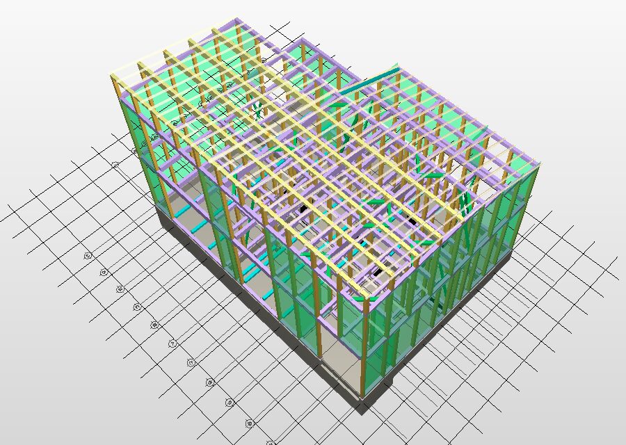 今回は2階に大きな勾配天井があるため、長尺の母屋を小屋束で受ける架構です。